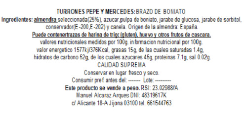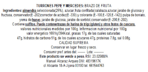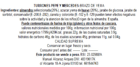 Para los que no hayáis probado este turrón os diremos que están elaborado con almendra mollar , ralladura de limón , azúcar. Los rellenos pueden ser de Yema confitada, Boniato Fruta, Boniato y Yema confitada.